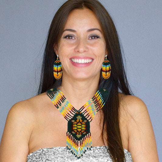 Handmade Beaded Turtle Design Deep Green Orange Necklace Earrings Set