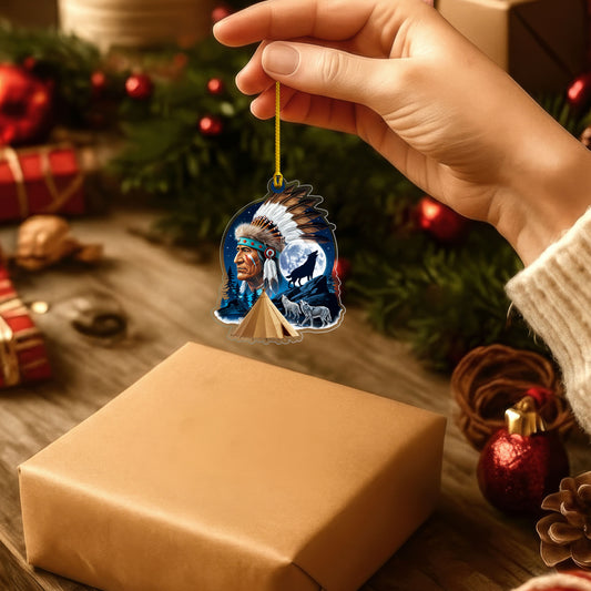 Native American Chief & Wolves Under Full Moon - Tribal Christmas Tree Decor Flat Acrylic