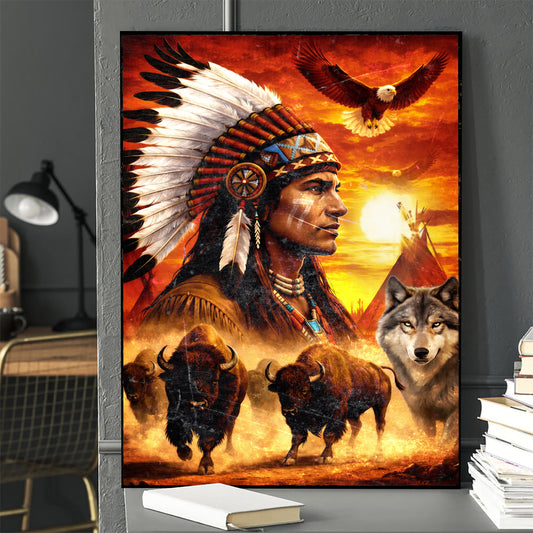Native American Chief with Beautiful Sunset and Spirit Animal Wall Art Poster/Canvas
