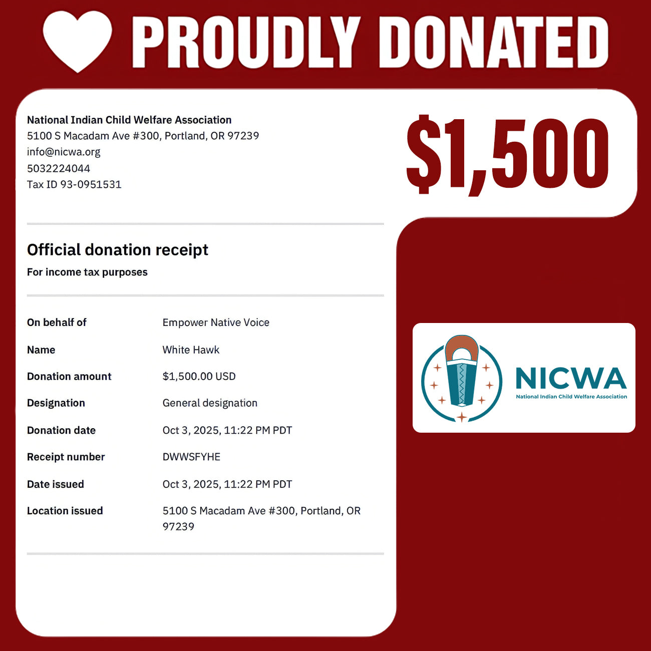 We’ve donated $1,500 to NICWA - an organization dedicated to protecting Native children and preserving their cultural roots.