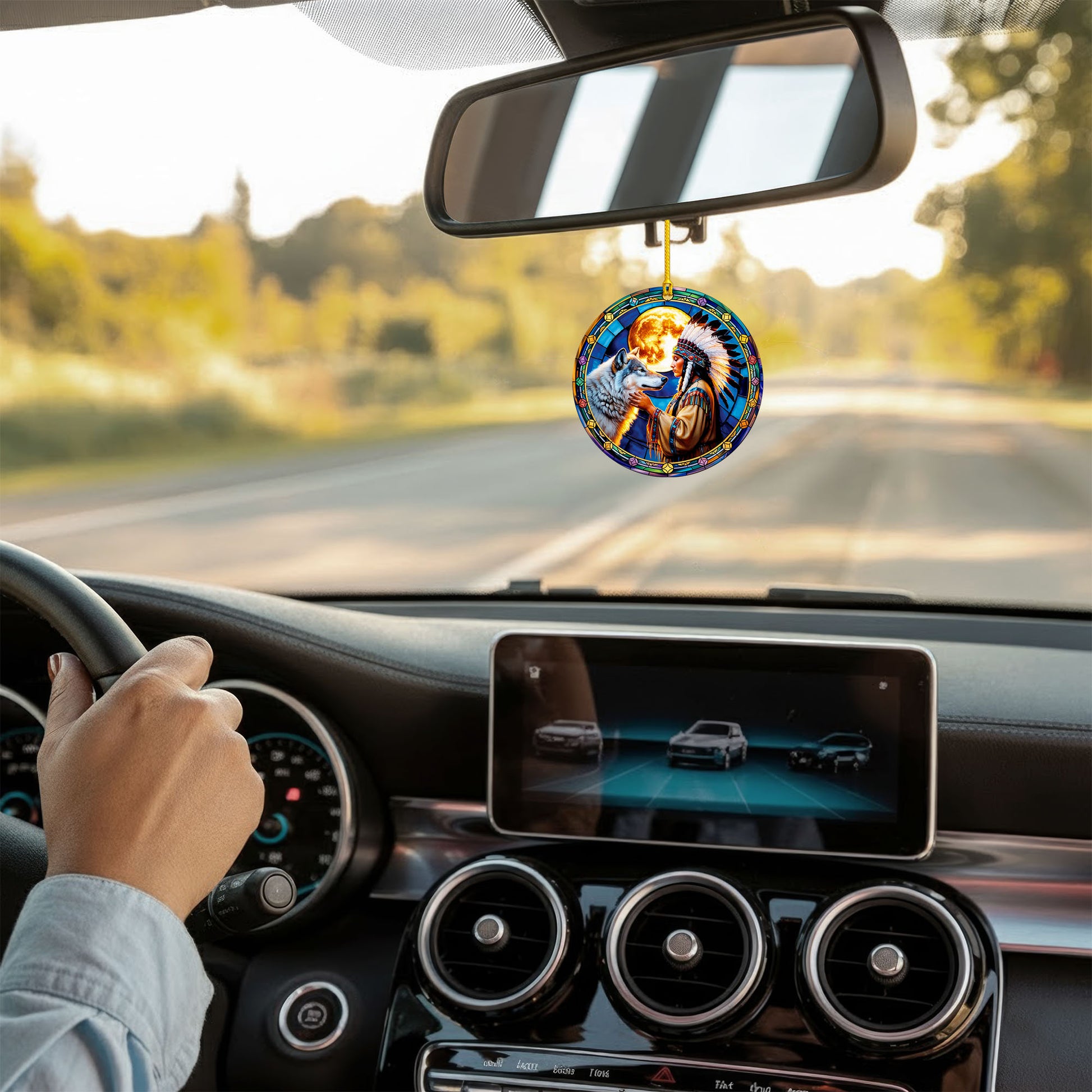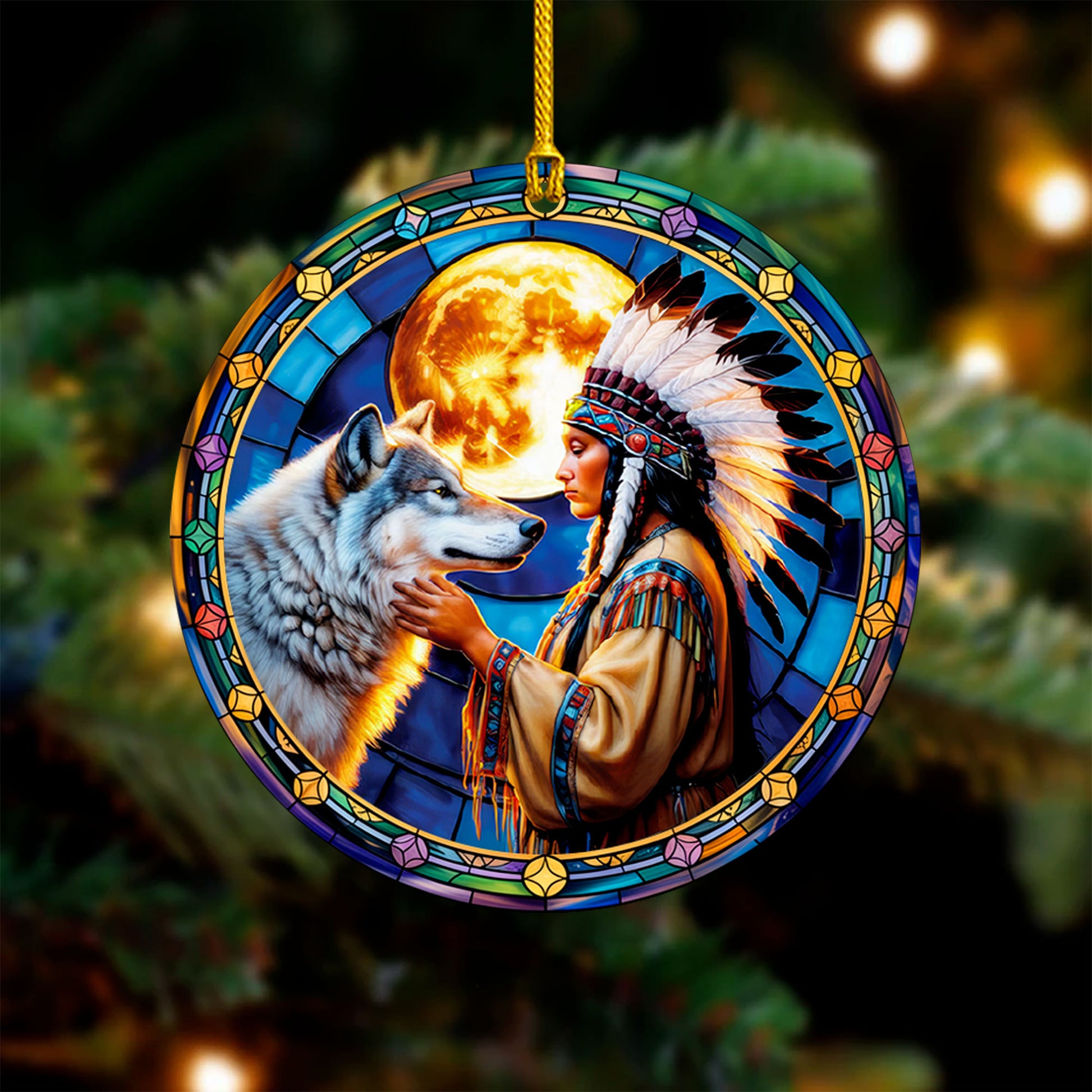 Native American Woman and Wolf Full Moon Christmas Tree Decor Flat Acrylic