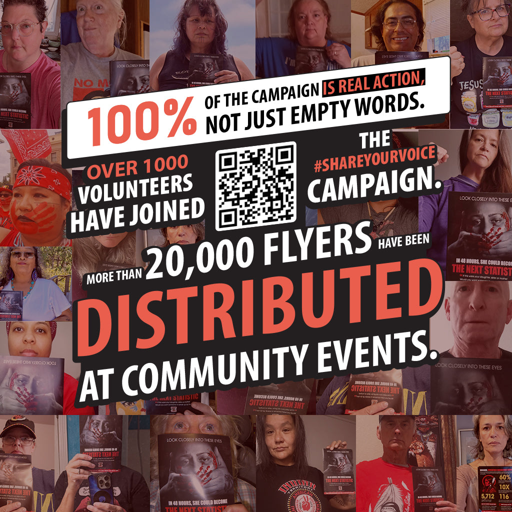 Join us as a volunteer to distribute flyers and support the #ShareYourVoice campaign. Together, we can raise awareness about MMIW and bring hope to the families of missing victims.