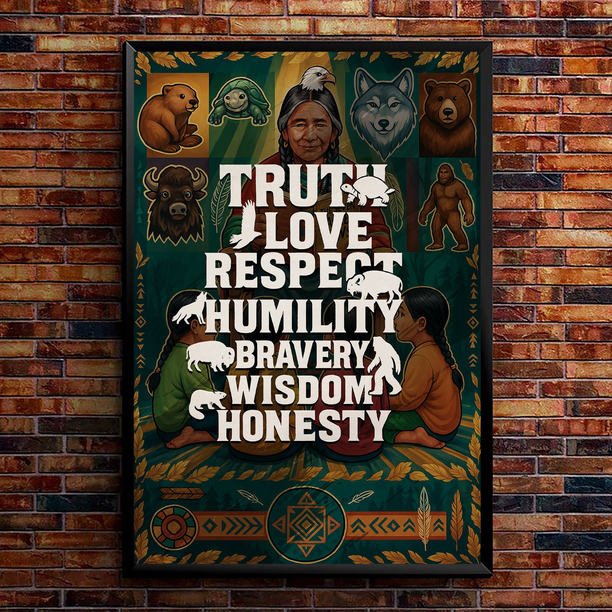 In time, the Grandfathers sent a helper to the Earth to find a worthy child, prepared by journeys across the four directions. When the child turned seven, each Grandfather bestowed upon him a spiritual gift: Wisdom, Love, Respect, Bravery, Honesty, Humility, and Truth.
